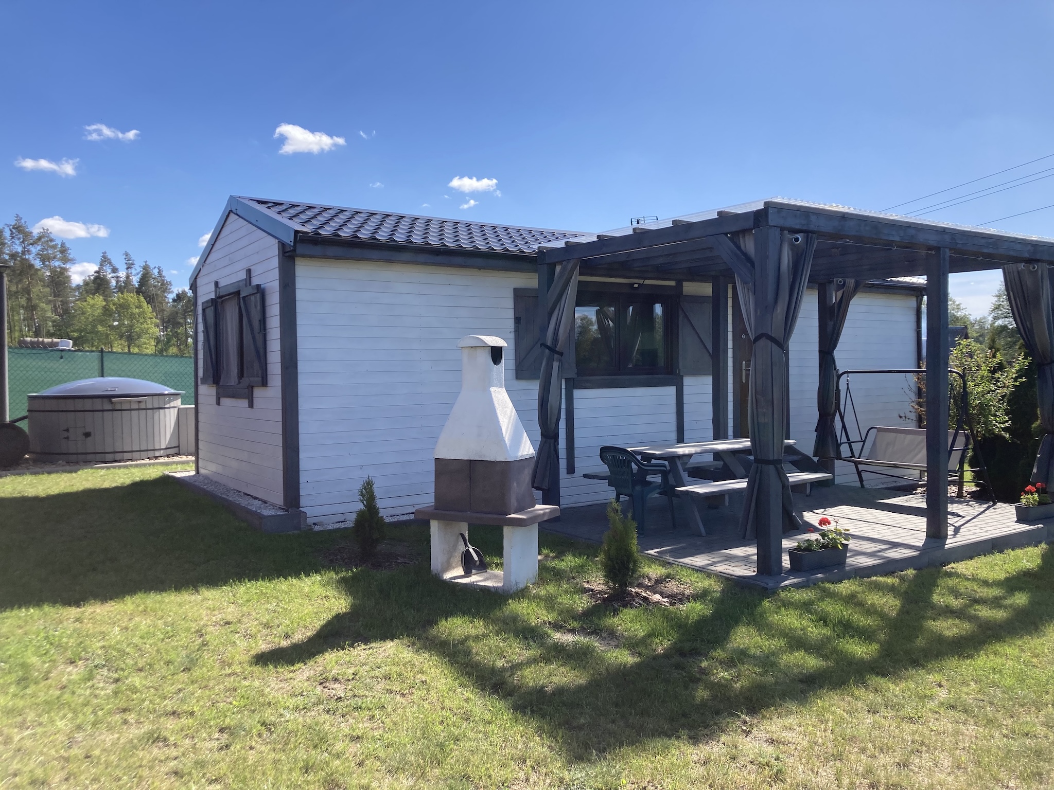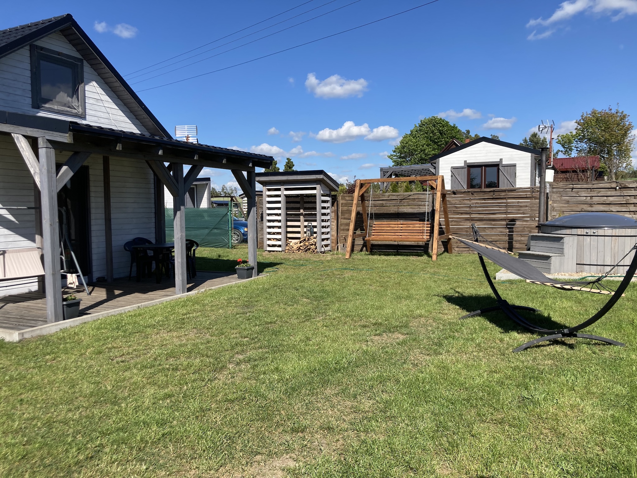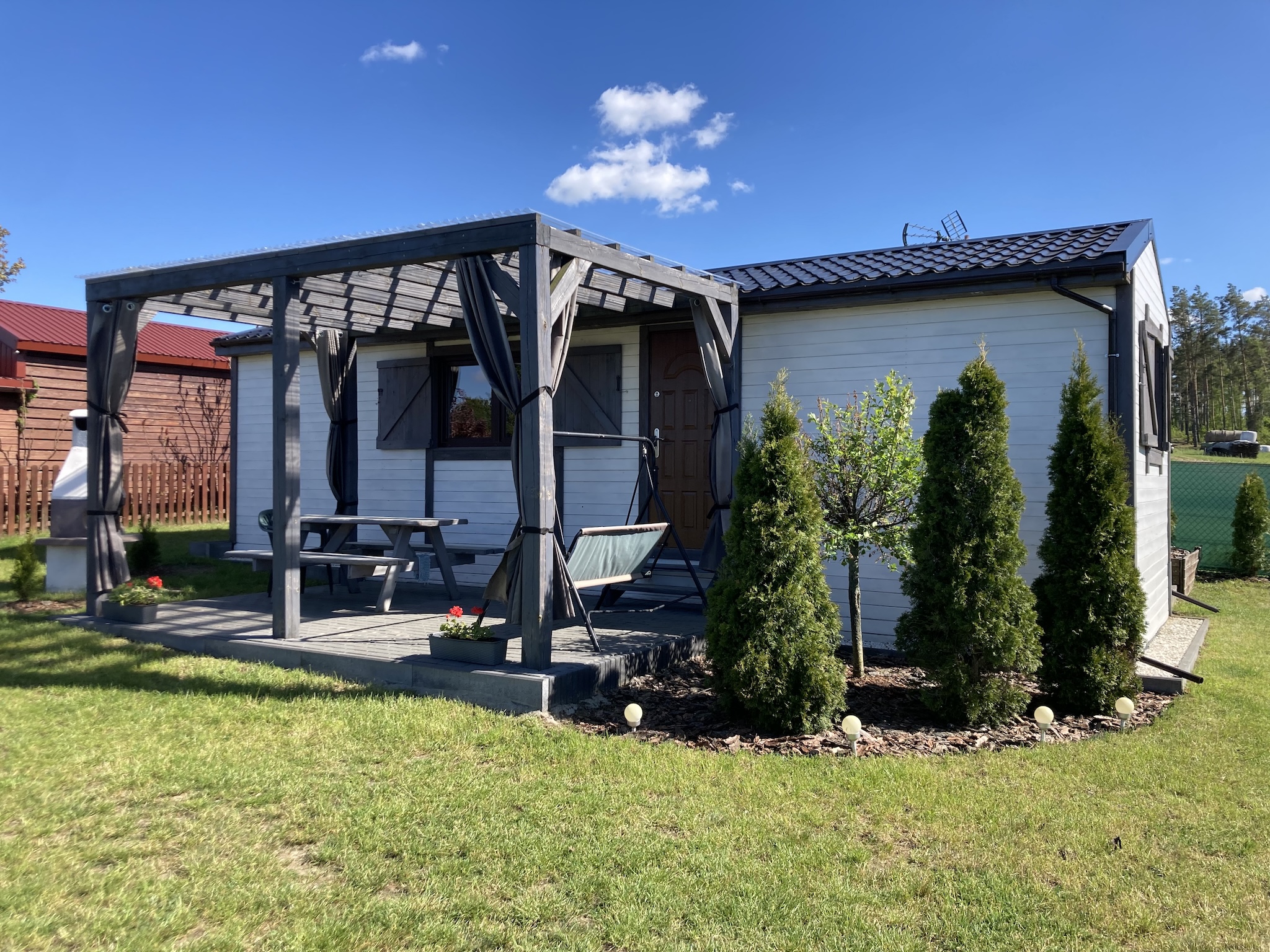 Każdy z nich jest na niezależnej działce, posiada prywatny zadaszony taras z drewnianym stołem, betonowym grillem, bujawką oraz hamakiem.