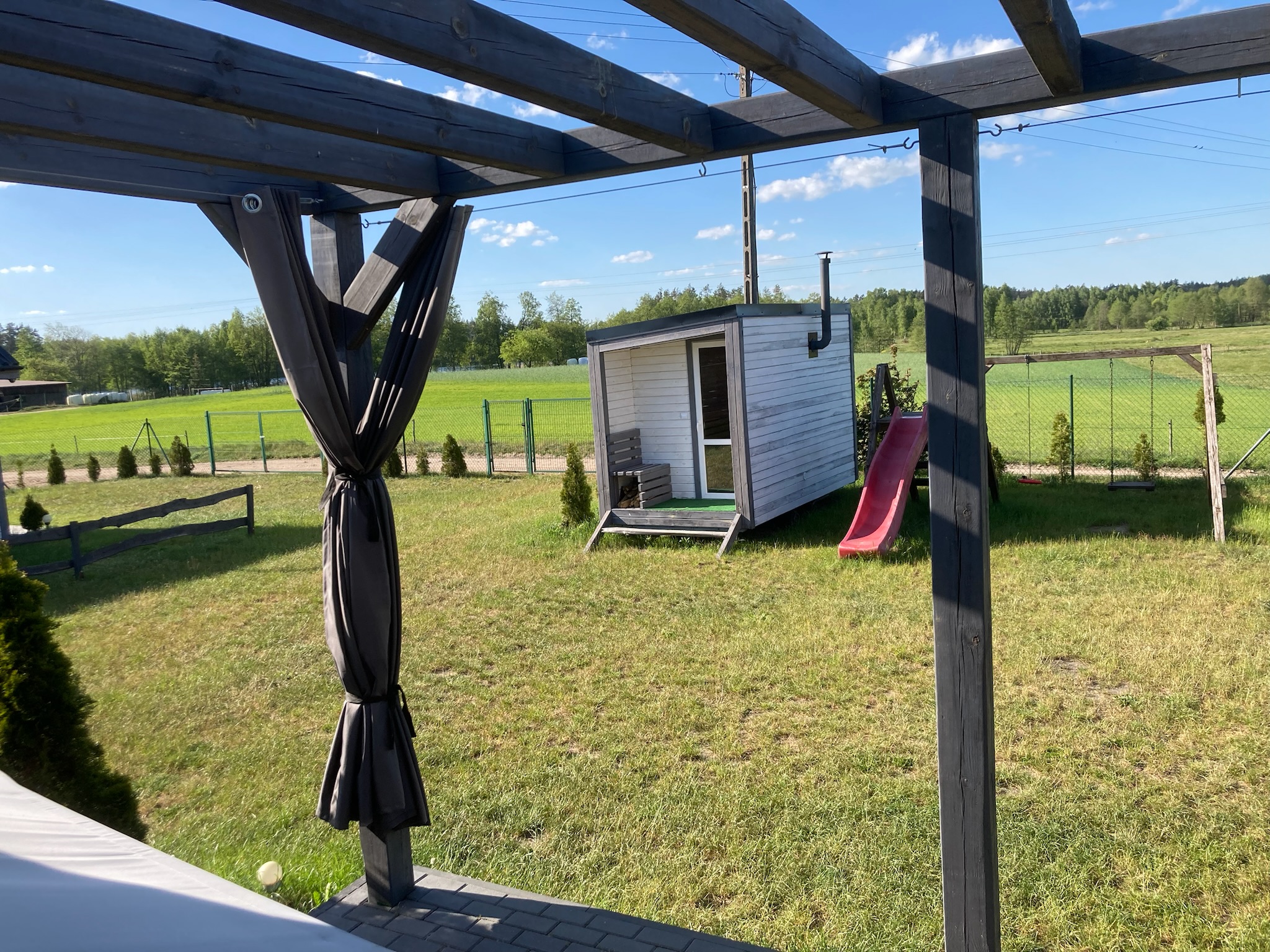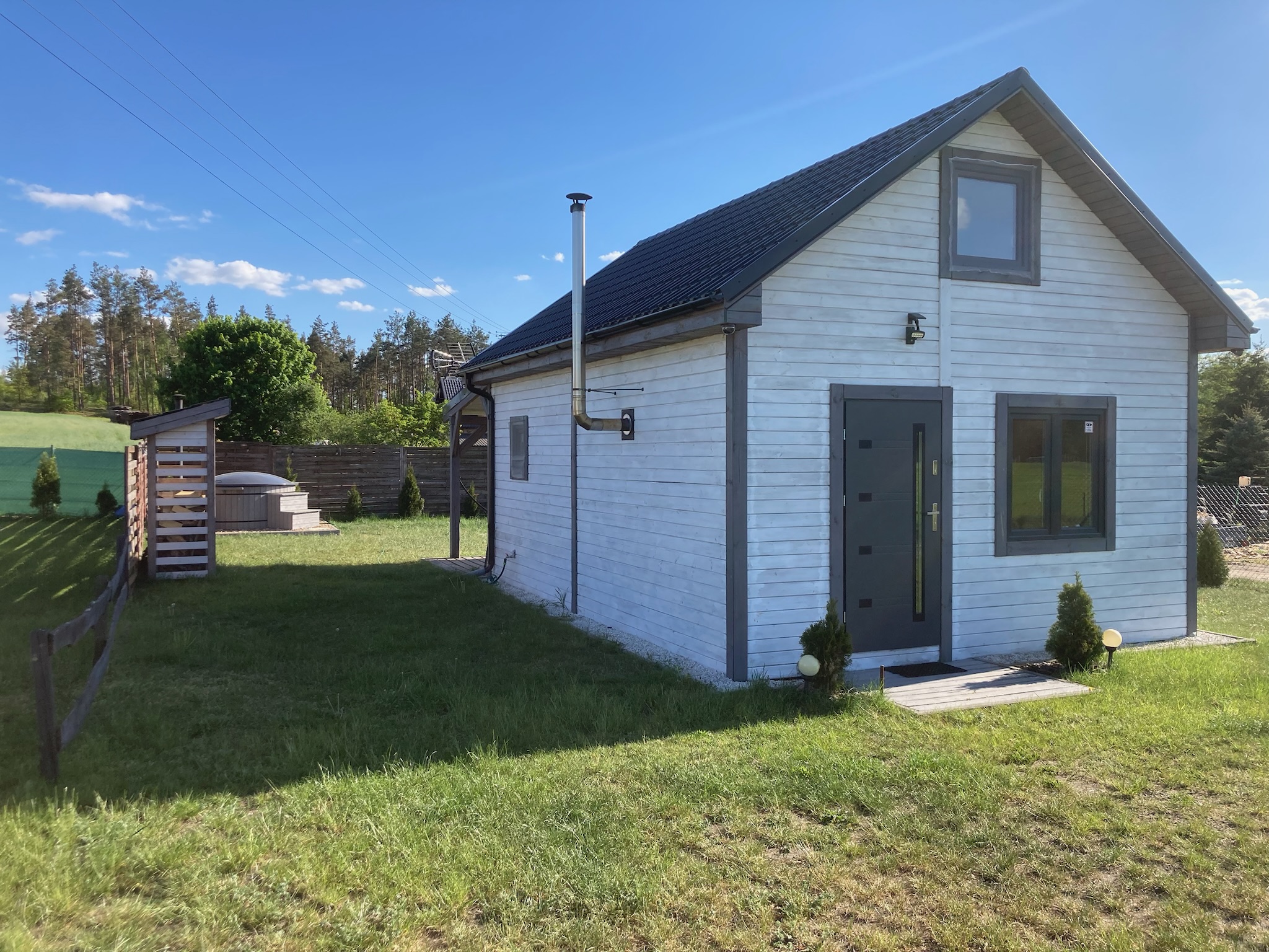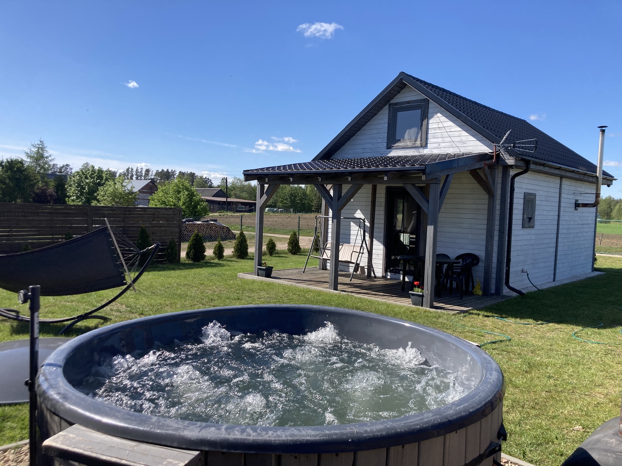 Każdy z nich jest na niezależnej działce, posiada prywatny zadaszony taras z drewnianym stołem, betonowym grillem, bujawką oraz hamakiem.